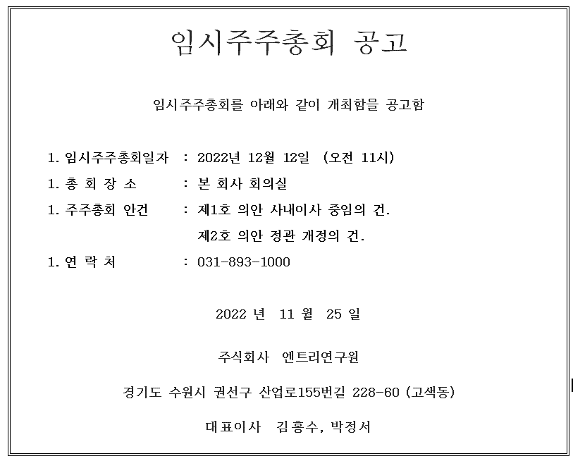 [엔트리연구원] 2022년 임시주주총회 소집공고