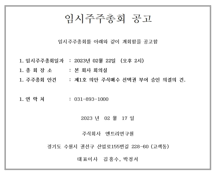 [엔트리연구원] 2023년 임시주주총회(1차) 소집공고