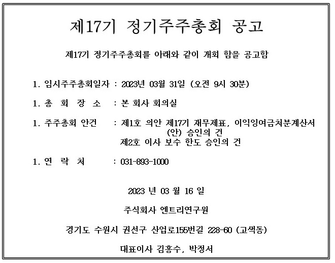 [엔트리연구원] 제17기 정기주주총회 소집공고
